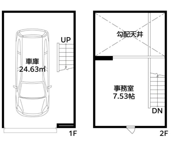 未完成物件(1R+ガレージ)、1階:24.63㎡(階段含む)、2階:14.95㎡、電気有、室内に給排水とガスの引き込み無し、男女別共用トイレ有、家賃保証加入要、借家人賠償責任付火災保険加入要