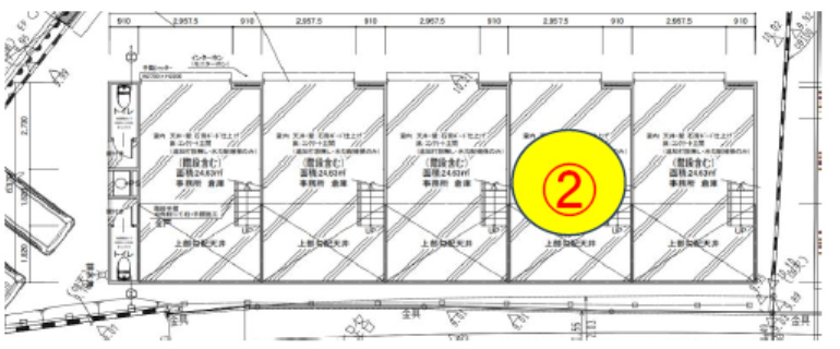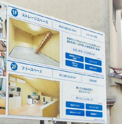 未完成物件(1R+ガレージ)、1階:24.63㎡(階段含む)、2階:14.95㎡、電気有、室内に給排水とガスの引き込み無し、男女別共用トイレ有、家賃保証加入要、借家人賠償責任付火災保険加入要