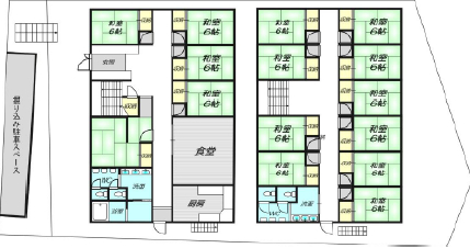 現状有姿・現状返し、貸室14室・管理室1室・食堂・浴室・共用トイレ・洗濯室完備、専用駐車場、短期解約違約金あり(1年未満:総賃料2ヶ月分/2年未満:1ヶ月分)、家賃保証加入要、火災保険加入要