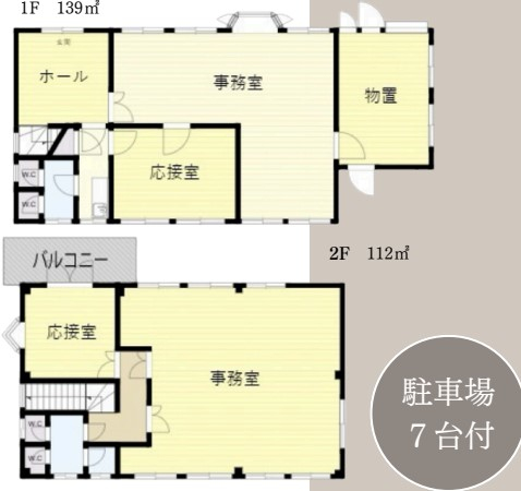 特色 | 第一種低層住居専用地域、現状渡し、1階:約139㎡、2階:約112㎡、土地面積:約614㎡、駐車場7台付き、家賃保証加入要、借家人賠償責任付火災保険加入要 |