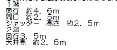| 特色 | 現状渡し、1階:11.50㎡、2階:8.75㎡、電気有、照明器具有(残置物)、コンセント有、シャッター鍵交換代22,000円、連帯保証人必須、家賃保証加入要、借家人賠償責任付火災保険加入要 |
